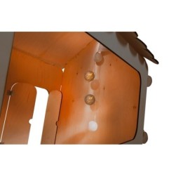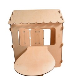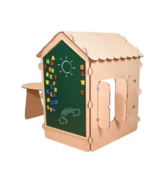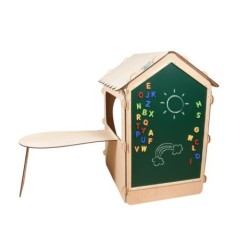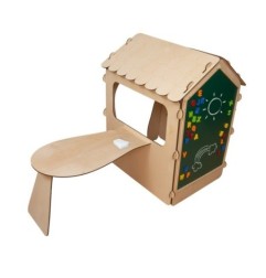 DOMEK DREWNIANY DLA DZIECI Z TABLICĄ KREDOWĄ I STOLIKIEM KULE LED 86 X 137 X 105 CM