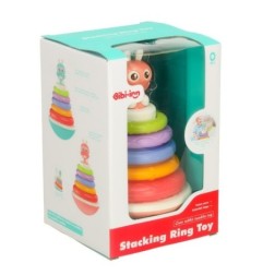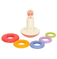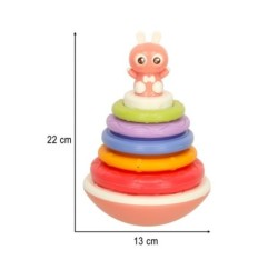 Zabawka składa się z bujającej się podstawy z małym przyjacielem – króliczkiem oraz pięciu krążków o różnej wielkości. Zadaniem dziecka jest nałożenie po kolei krążków, aby zbudować tęczową wieżę. Po każdym nałożeniu okręgu, z zabawki wydobywa się wesoła melodia, zachęcająca malucha do dalszej zabawy.
