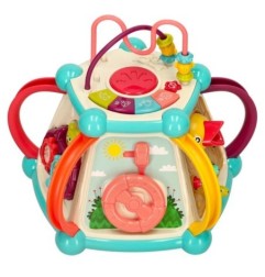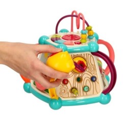 Każdy z boków kostki kryje nowy element do odkrycia. Różne faktury, kolory, kształty i sposoby interakcji z elementami stymulują zmysły dziecka i rozwijają jego ciekawość świata. Zabawka stanowi również doskonałą okazję do nauki kolorów oraz cyfr.