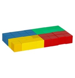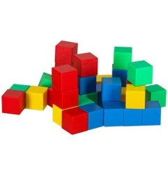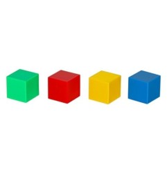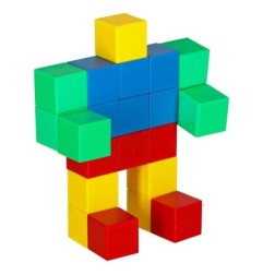 Każdy klocek ma kształt kwadratu, co pozwala dziecku swobodnie tworzyć zarówno proste, jak i bardziej złożone budowle. Klocki są w intensywnych kolorach: zielonym, żółtym, czerwonym i niebieskim, co przyciąga uwagę, zachęcając do tworzenia kolorowych projektów.
